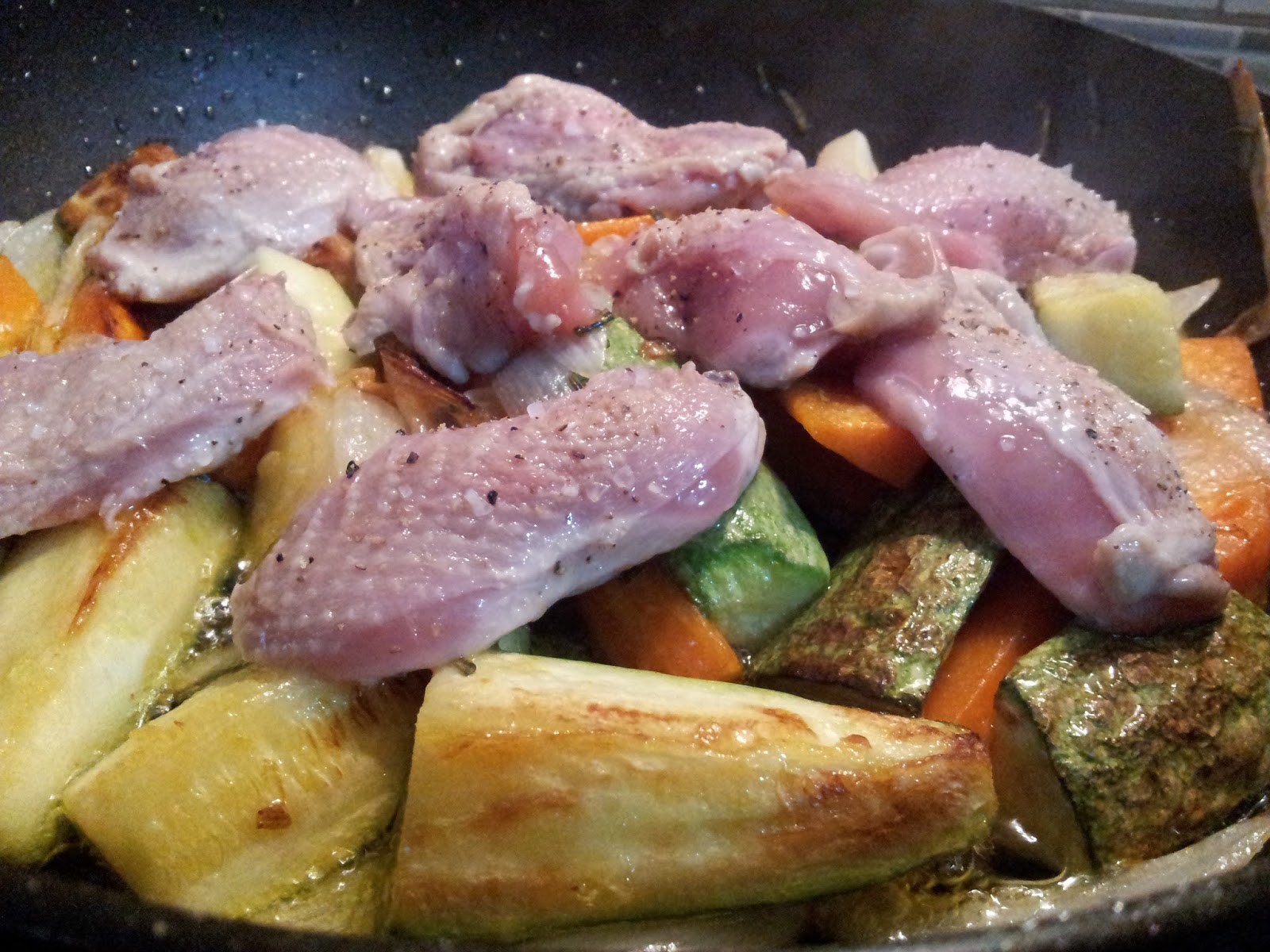 añadiremos las pechugas de codornices encima de éstas verduras. Sin moverlo,